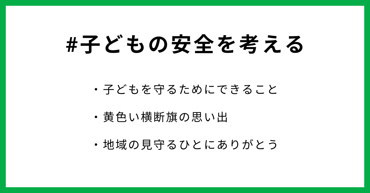 そんな現状をふまえ、いまわたしたちにできることはなんでしょう。子どもたちが安心して歩ける街にするために、こくみん共済 coop とnoteのコラボコンテスト「#子どもの安全を考える」で募集します。通学路での子どもたちの見守り活動、黄色い横断旗を持ったひとに救われたエピソードなど。 あなたの投稿が、だれかの命を守る一歩になるかもしれません。ぜひみなさんの考えや想いを投稿してください。