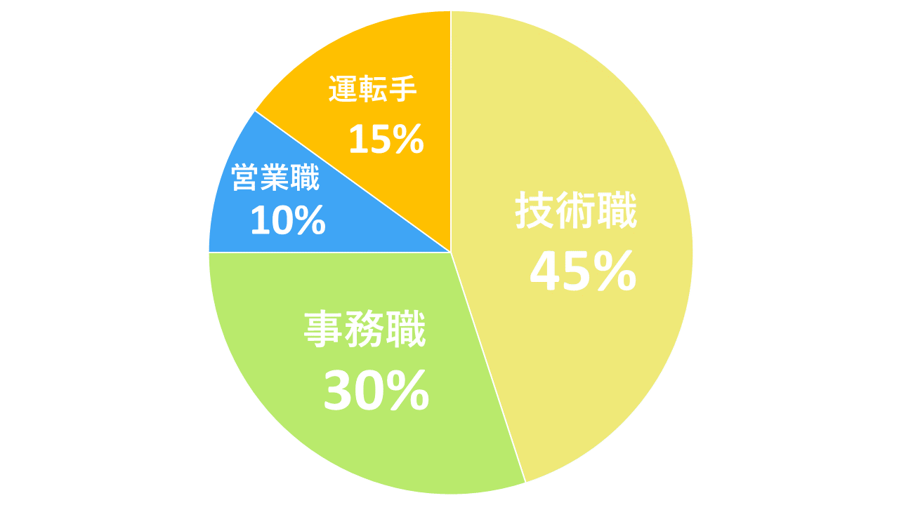 現場職種の人数が多いこともあり、男性の割合が高くなっていますが、女性も働きやすい職場づくりに力を入れています。