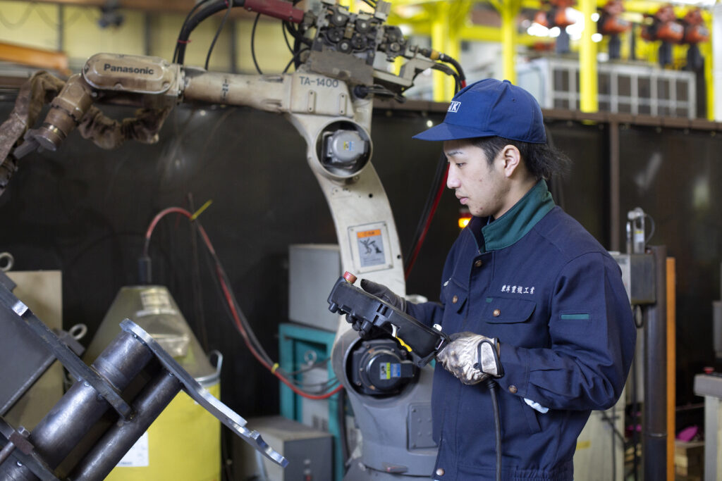 仮付けや溶接を行うほか、部品の位置固定やロボットによる溶接のセッティング、機械や部材の移動、掃除など、細かい作業にも取り組んでいます。大きな機械の溶接やその後の掃除は時間がかかり、時にはうまく動かせずに苦労することもありますが、他の人と協力して作業を進め、納期に間に合わせたときの達成感は格別です。できることが増えていく中で、仕事がますます楽しく感じられます。