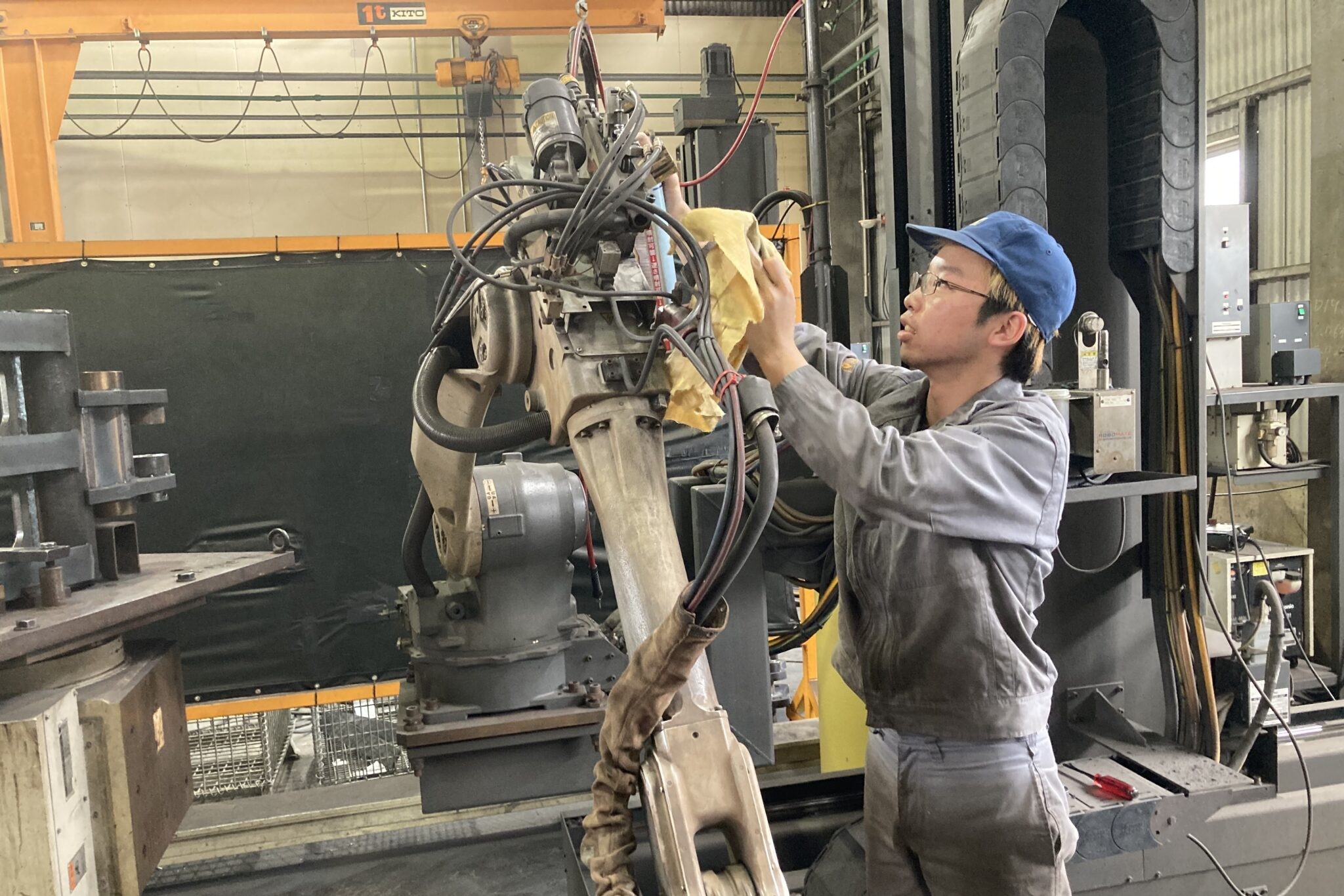 建設機械アタッチメントの製作における溶接を担当しています。仮付けや清掃に加えて、ロボットを使用した溶接作業も行っています。ロボットは動きがプログラムされており、設定が完了すれば自動で溶接してくれますが、設定が正確でないと溶接位置がずれてしまうことがあるため、正確さが求められます。操作に慣れるまで時間がかかりましたが、今ではしっかりと使いこなせるようになりました。